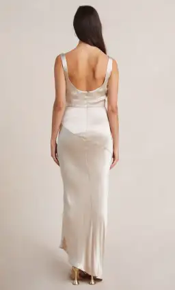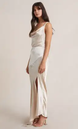 The Moon Dance Cowl Dress features a flattering cowl neckline with a low scoop back and a side split on the skirt. The maxi dress is designed to create a feminine hourglass silhouette, cinching in at the smallest part of the waist.