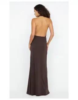 The Bec and Bridge Nessie Cowl Maxi Dress in Dark Chocolate is a sleek, elegant piece crafted from soft jersey fabric. With a halter neck and plunging cowl neckline, it features a built-in bust layer for support and an elasticated waist seam for a flattering fit. Designed to skim the body, this maxi dress flows into a straight silhouette.