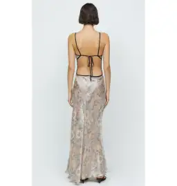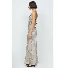 Bias cut maxi dress. Dress has contrast outside bind which carries through to straps and finished at x/back. Dress has keyhole cutout at CF. Low cut back. Not bra friendly. Narrow rolled hem.