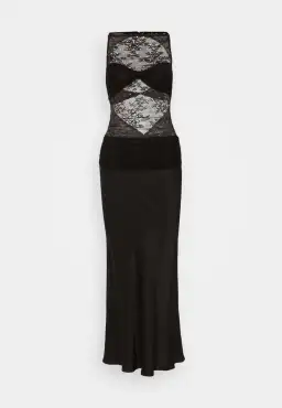 The Pfieffer Maxi Dress is a statement style featuring a printed sheer lace bodice. The dress features a straight neckline, contrast bralette and skirt panel, full skirt and statement open back.