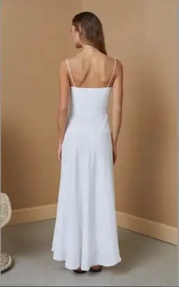 Embroidered linen maxi dress, featuring thin rouleau straps, slight sweetheart neckline, small underbust cutout and a bias cut skirt. This dress comes in at the waist, with a flowy skirt with a raw hem. It is versatile, able to be dressed up for evening wear, or paired with sandals for a daytime look. Popular for bridal engagement parties, as well as the races and ball events.