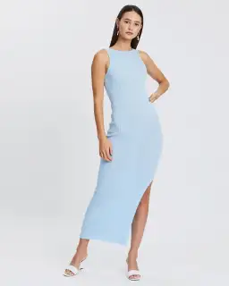 Signature Bec and Bridge stretch rib midi dress with open back twist detail, subtle 3/4 split and high boatneck.