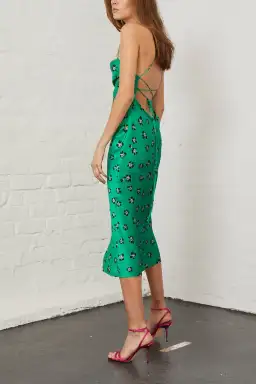 Pure silk bias cut midi in floral print with lace up back detail.
