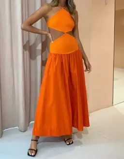 One of my all time favourite dresses with the eye catching colour Chili! Perfect for any occasion especially garden weddings and engagement parties. Kept in pristine condition. Featuring a diamond halter neckline, tie up rouleau straps and waist cut outs extending to an open back.
