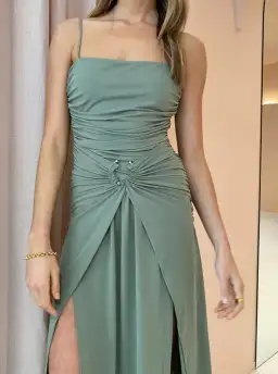 An easy to wear statement maxi dress with flattering gathered ruching and wrap detail around the waist and u-ring hardware at the centre front. The Vixen Maxi Dress features a classic straight neckline and adjustable tie at the back.