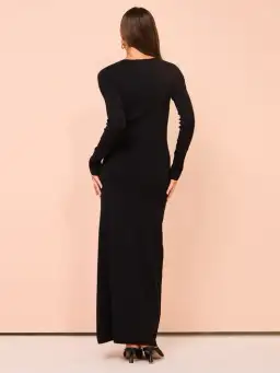 Crafted from a knit ribbed fabric, the BEC + BRIDGE Alienor Keyhole knit dress is a statement design. The long sleeve maxi dress features a round neckline with asymmetrical row of buttons and key hole cut outs, mid thigh split, slit at cuffs with keyhole cutout and button closure.