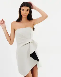 Mini strapless dress featuring tuck detailing at waist.