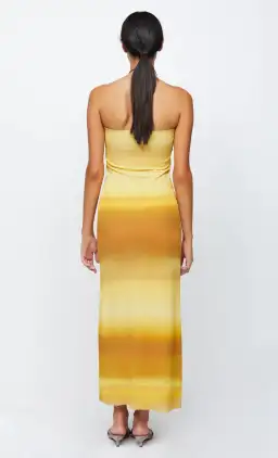 The Amara Strapless Dress is cut from a statement ombre fabric. The easy-to-wear, sheer dress features encased elastic on the top edge, bust darts and a raw hem.