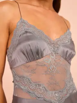 Crafted from a satin feel fabrication, this maxi dress features a flattering V neckline, stretch lace that is seen through the mid section and gathered bust cups.