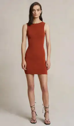 Bec and Bridge Brick Sorbet Summer Knit Mini Dress. Reversible. Twist cut out detailing. Mini length. V neckline. Sleeveless. Knit fabric. 65% viscose; 35% nylon.
