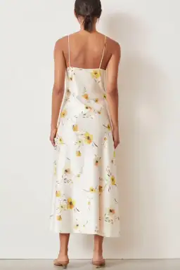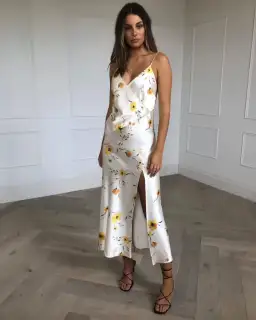 This floral slip dress features a delicate yellow and white flower pattern on a creamy white background. With spaghetti straps, a V-neckline, and a subtle front slit, it's perfect for warm-weather events, combining comfort with effortless elegance.