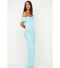 A captivating blue sheer maxi dress crafted from soft mesh and georgette, featuring an asymmetric neckline with a dramatic draped design.