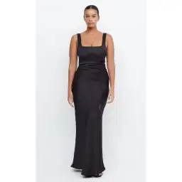 A timeless classic, the Dreamer Square Neck Dress is an easy to wear formal style that flatters all silhouettes. The maxi length dress features a square neckline and a dramatic side leg split. The gathering detail around the waist and hips disguises any unwanted lines on the body.