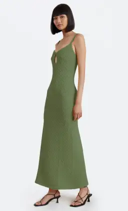 A statement eventwear dress in sage green. The Effie Key Maxi Dress is spun from a unique basket-weave textured knit fabric that hugs the silhouette. The feminine design features a V-neckline to highlight the décolletage and a keyhole cut-out detail underneath the bust.