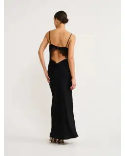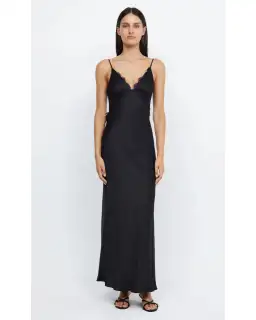 The effortless and elevated BEC + BRIDGE Emery Lace Maxi Dress features a v neck with under bust seam and lace detailing. The bias cut dress features adjustable Rouleau straps that lead around to an open back with e-hook hardware and a soft cowl drape. Dress is finished with a raw edged hem.