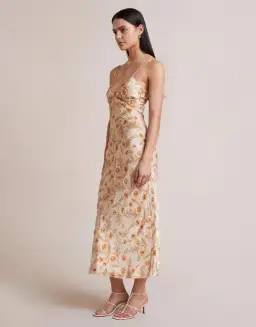 Soft silk print fabrication this midi dress is designed to slip and skim in all the right places. Sitting fitted through the bust and waist then falling into an elegant midi skirt. Featuring a flattering V-neckline with front cut out details and rouleau straps, the Fleetwood Midi will be the perfect plus one to wedding festivities, birthday celebrations and cocktail hour.