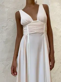 Crafted from a crepe fabrication, this figure skimming maxi dress features a gathered bust with a plunging neckline which is complimented with a ruched waist panel before falling into a voluminous maxi skirt.