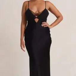 "The Heather Maxi Dress is a flattering event wear style. The maxi dress features silver e-hook hardware, a two-toned statement triangle layered bra and an under bust cut away and is finished with thin rouleau straps that wrap around to a v-cut out low back. This garment is certified Australian made."