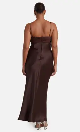 The Julieta V Maxi Dress is a flattering and chic eventwear style by Bec & Bridge. The maxi dress features a plunge V-neckline with gathered bust detailing and an underbust cut away. The dress is complimented by ruch detailing and thin rouleau straps that tie at a flattering open back.