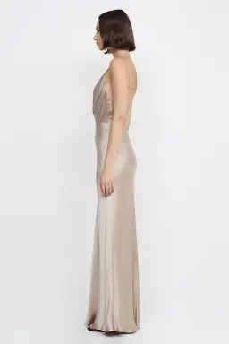 A sleek and feminine event wear style, the Lorelai V Maxi Dress is cut on the bias from a speciality fabric that skims the silhouette. The effortless maxi dress features a plunging V neckline, bust darts at princess line and thin spaghetti straps, finished with a narrow rolled hem.