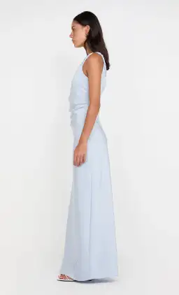 Lunetta Twist Strap Dress in Dusty Blue. An elegant and modern maxi dress, perfect for bridesmaids and special occasions.
