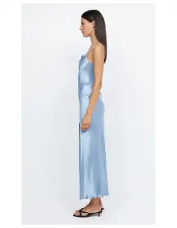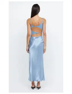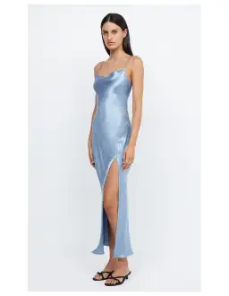 Cowl neck with thin rouleau adjustable straps. Front leg split detail. Statement asymmetrical back with contrast mesh cut out design. Bias cut.