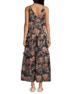 Beautiful floral detailing which features V line neck detailing mirrors the back with an adjustable self-ties on the side, then falls into a gathered tiered skirt, very elegant and comfortable feel when worn.