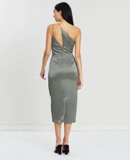 Crafted from sumptuous mid-weight satin, the Mila Asymmetric Midi Dress by Australian label Bec & Bridge forms part of an elegant cocktail edit