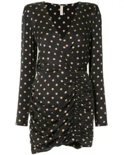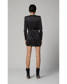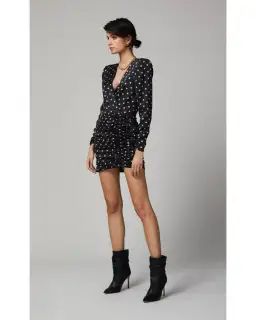 Printed silk long sleeve mini dress gather detail on skirt and cuff slight shoulder pad plunge neckline wrap style top invisible zipper at back for entry Designed + made in Australia Model Stats: Model is wearing an AU 6 / XS Height: 180cm / 5’11” Bust: 81cm / 32” Waist: 60cm / 24” Hip: 88cm / 34.5” 100% SILK
