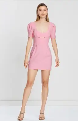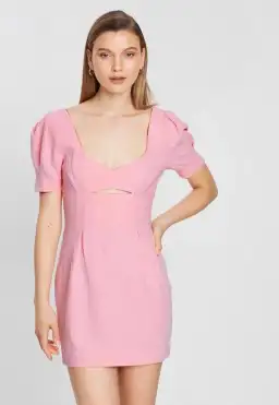 A fitted mini with V neckline and cut out under the bust. The Sweet Pea Mini has puff sleeves.