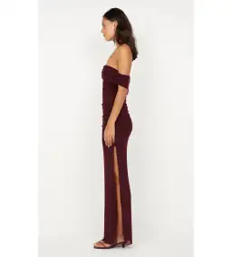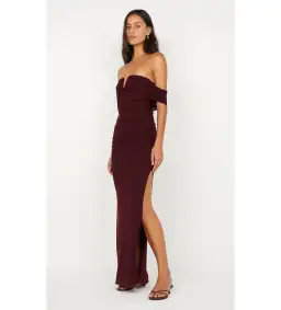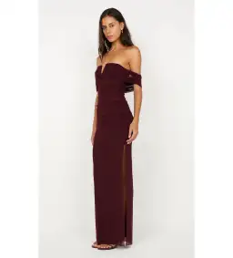 Poppy Gathered Maxi Dress in Plum. This elegant gathered maxi dress, crafted from soft mesh, features an off-the-shoulder neckline and a flattering side split, creating a sophisticated silhouette perfect for a wedding guest ensemble, formal events, or a stylish night out.