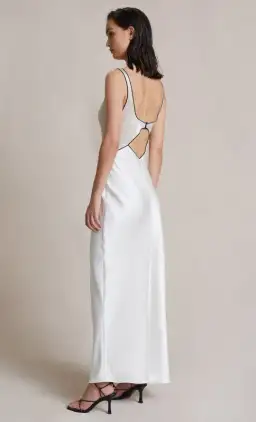 A flattering bias-cut maxi dress in pearlescent ivory. Features a v-neck and waist-line cut-out. Twist-front and contrast-stitch detailing.