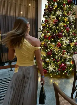 An effortless and elevated style designed in a statement silhouette. The dress features an asymmetrical, off-shoulder neckline, stretch bodice with gathering at side seams and a contrast heavily gathered panelled skirt that falls from the hips with a leg split.