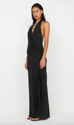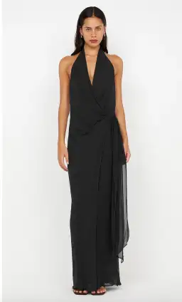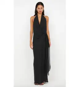The BEC + BRIDGE Soneva Wrap Dress in Dark Chocolate is a stunning maxi dress crafted from georgette fabric. Featuring a halter neckline with an elasticated neck band, the wrap style ties at the low waist, creating a flattering silhouette. The dress has a V neckline, a low back, and is fully lined for comfort and elegance.