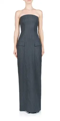 Made from a luxurious pinstripe wool blend fabric, the Bec + Bridge Pine Strapless Maxi Dress provides a sleek and flattering silhouette. Accented with front flap pockets and side slit pockets, it features a straight strapless neckline and back vent, fitted at the waist before falling into a straight skirt.