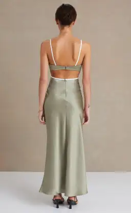Best selling bias cut maxi dress with silk contrast stap detail and a statement plunging neckline.