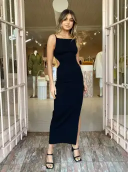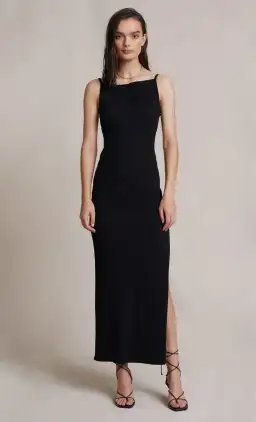 The Zion Midi Dress adds edge and sophistication to the ubiquitous black dress for the summer months. Featuring a straight neck, midi length, side split, and cut out detailing on the waist and back. We love this styled with heels for pm or sandals for that daytime event.
