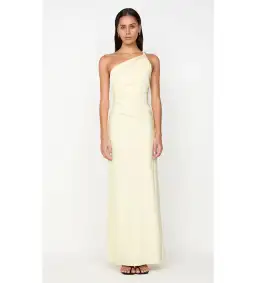 The BEC + BRIDGE Lunetta Asym Dress in Ice Yellow is a chic, sophisticated one-shoulder maxi dress crafted for an elegant events look. With a twisted asymmetrical strap and waist ruching, this dress flatters the silhouette and flows gracefully into a full, bias-cut skirt. Pair with BEC + BRIDGE Kate Heel for evening events, weddings, or cocktail parties where a refined, statement look is desired.