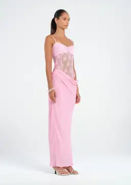 The Akio Maxi Dress features a lace bodysuit with net mesh-lined side panels and a ribbed finish along the edges. Adjustable straps and stud closures at the gusset ensure a secure fit, while the jersey-lined bust panel, with delicate gathers through the center front, creates a soft sweetheart neckline. The bias-cut chiffon skirt drapes fluidly and is fully lined for a smooth finish. Attached only at the wearer’s right low waist, the skirt forms a softly draped waist cowl that defines the silhouette.