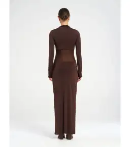 The Dora Maxi is designed with a high neckline, long sleeves, and twist-front detail on the skirt. Sheer mesh panel curves under the bust, defining and accentuating the silhouette.