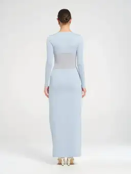 The Dora Maxi is designed with a high neckline, long sleeves, and twist-front detail on the skirt. Sheer mesh panel curves under the bust, defining and accentuating the silhouette.