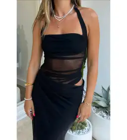 The Gina Maxi Dress is the perfect summer update of our popular Yasmin Maxi Dress. The halter mesh top adds a touch of elegance, while the gathers through the waist create a flattering silhouette. The cupro skirt features a stylish cowl on the wearers left side waist.