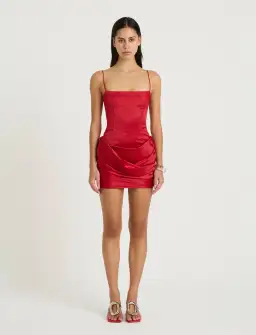 The Joel Mini Dress features a structured bodice with panel detailing for a contoured fit, a scoop neckline, and thin spaghetti straps. Draped skirt panels add movement and shape.