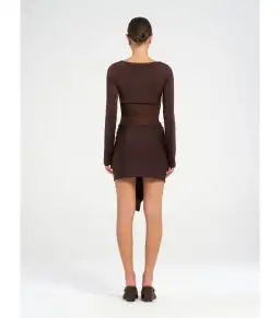 The Juni Mini Dress by BENNI has long sleeves and a wide boat neckline design. The sheer waist panel curves under the bust, while the skirt is softly gathered and drapes to one side.