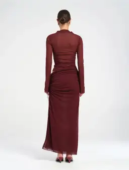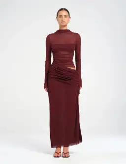 The Mable Maxi Dress is a sheer, long-sleeve dress with a high neckline, crafted from stretch mesh. It features a built-in jersey bralette panel for added coverage. Designed with a flattering cowl detail on the wearer's side waist. The straight-cut skirt includes a side split with an adjustable drawstring and is lined with mesh for extra comfort.