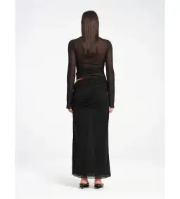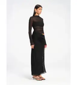 The Mable Maxi Dress by BENNI is a sheer, long-sleeve dress with a high neckline, crafted from stretch mesh. It features a built-in jersey bralette panel for added coverage. Designed with a flattering cowl detail on the wearer's side waist. The straight-cut skirt includes a side split with an adjustable drawstring and is lined with mesh for extra comfort.