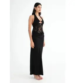 Miko Maxi Dress features a flattering V-neckline, intricate lace bodysuit, and a luxurious cupro skirt with our signature cowl front. Perfect for any occasion and is sure to turn heads.