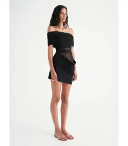 Meet the Nico Mini Dress, featuring an off-shoulder design crafted from a lightweight stretch mesh and flattering cupro skirt with a cowl on the left side waist. The overlapping skirt and mesh bodice creates depth, with the option to show more skin on the wearer's left hand side waist.