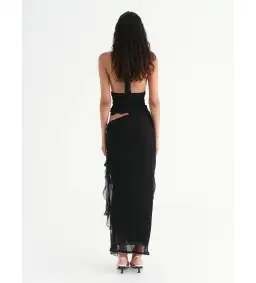 The Penelope Maxi Dress is a summer-ready silhouette crafted from stretch mesh fabric. The bodice features a halter neck and gathers at the waist. The skirt, attached at the wearer’s left side, reveals a hint of the waist and boasts a high split with a ruffle along the hem.