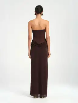 The Petra Maxi Dress features a bandeau neckline and panelled waist detailing. Crafted in a mix of stretch jersey and sheer mesh, the bust is lined for full coverage and the floor length skirt is finished with our signature a draped cowl waist detail.